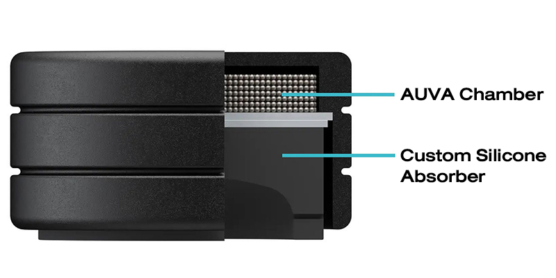 AUVA โครงสร้างหลักที่เป็นบอดี้โลหะอลูมินั่ม จะจัดการกับแรงสั่นสะเทือนภายในที่ต้นกำเนิด เมื่อเกิดแรงสั่นสะเทือนจากไวเบรชั่นเล็กจากตัวเครื่องเสียง หรือการสั่นจากภายนอก โดยใช้อนุภาคโลหะเล็กๆ ที่เป็นลูกปืนจิ๋วขนาดเม็ดทราย เมื่ออนุภาคเคลื่อนที่และชนกัน พลังงานจะถูกแปลงให้เป็นความร้อนและสลายไปอย่างรวดเร็ว ซึ่งจะช่วยขจัดเสียงรบกวนก่อนที่จะส่งผลกระทบต่อเสียง
